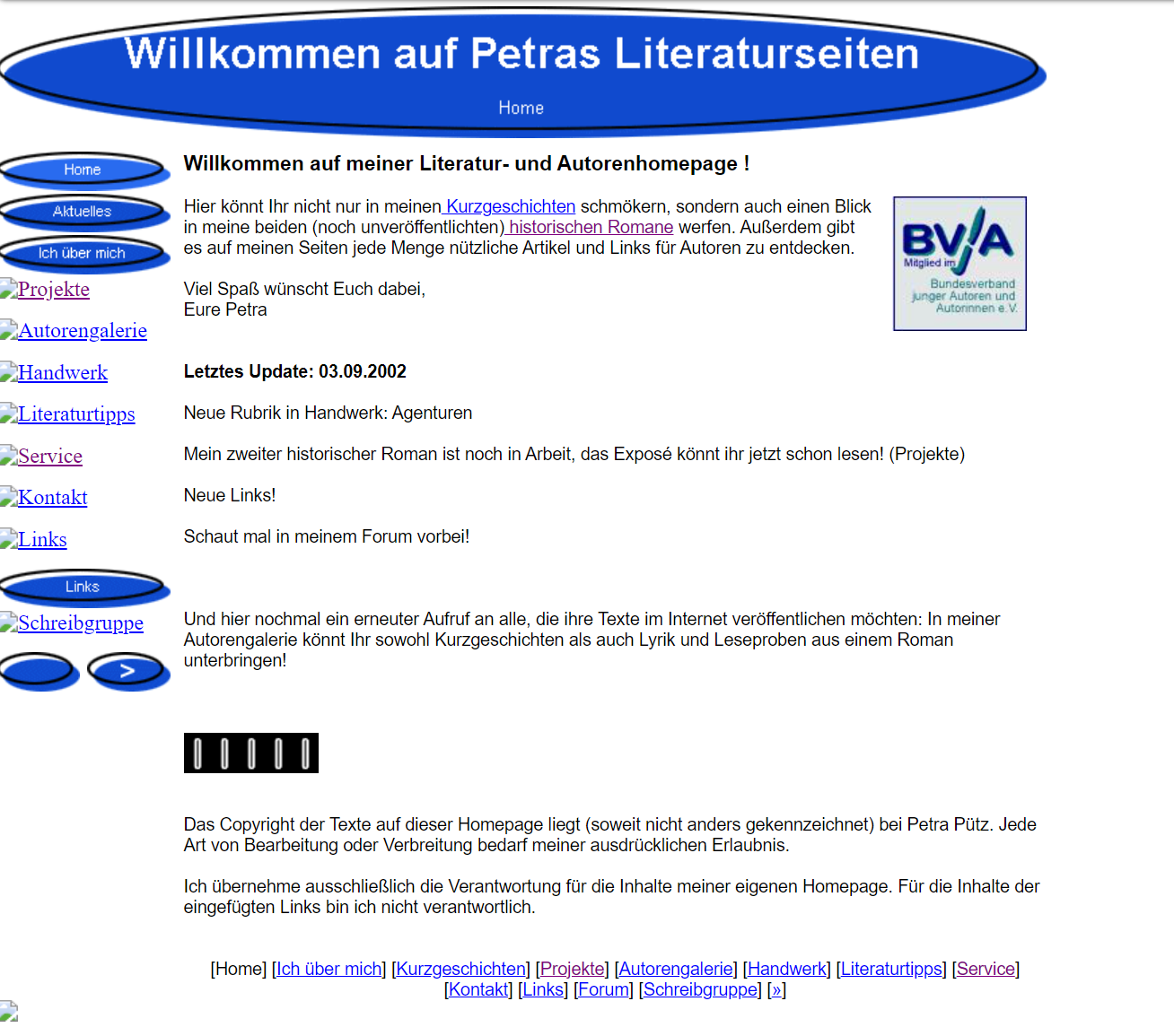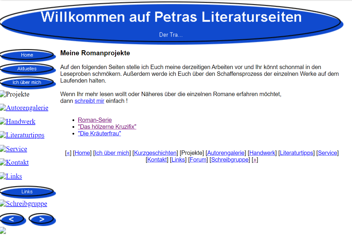 Hier und da sind zwar ein paar Buttons nicht sichtbar, weil die Wayback Machine sie nicht mitgespeichert hat, aber ich denke, die folgende Fotogalerie gibt einen guten Eindruck davon, wie meine Website, damals noch unter www.petralit.de.vu erreichbar, ausgesehen und welche Rubriken es gegeben hat.