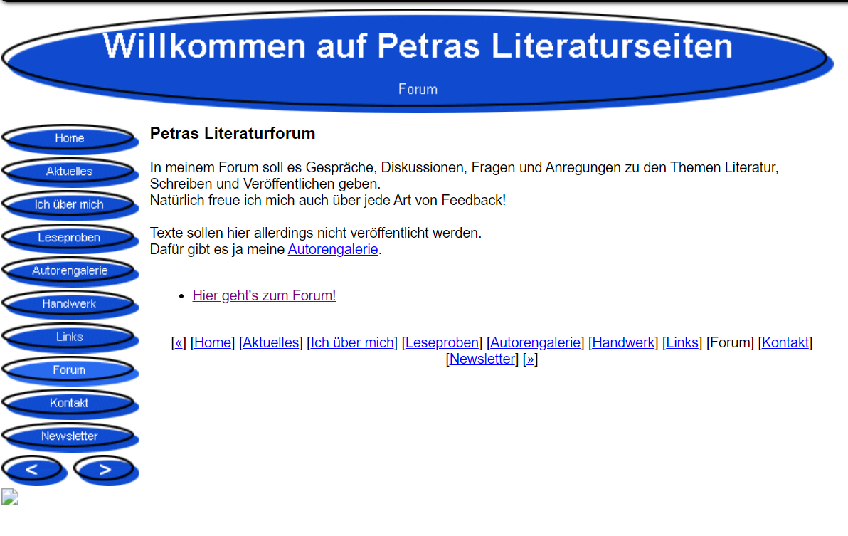Wie ihr seht, gab es sogar damals auch bei mir ein Literaturforum. Dazu werde ich euch in einem der kommenden Blogbeiträge noch ein bisschen mehr berichten. Ich hoffe, ich finde im Archiv der Wayback Machine ein paar gute Abbildungen dazu.