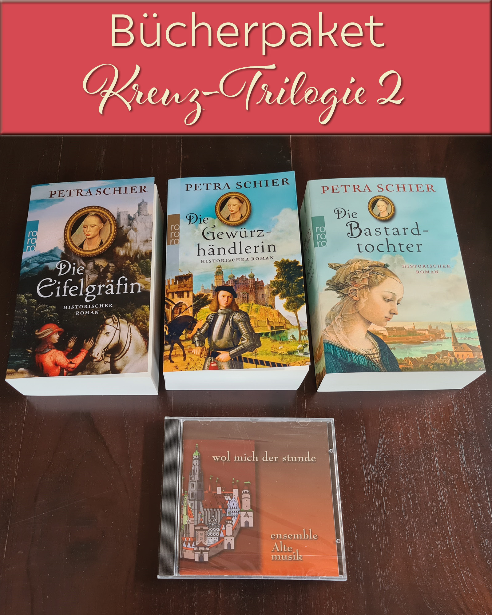Das neunte Paket zur Versteigerung enthält alle drei Taschenbuchausgaben meiner historischen Kreuz-Trilogie, signiert selbstverständlich. Weiterhin enthalten sind eine CD “Wol mich der Stunde” mit mittelalterlicher Musik, die zum Teil auch in den Büchern vorkommt, sowie ein paar kleine Überraschungs-Goodies. Startgebot: 15,- Euro Aktuelles Höchstgebot: 80,- Euro Ende der Versteigerung: 11.09.2021, 24 Uhr Gebote können an mich (Petra Schier) via PN/Messenger, E-Mail an buecherversteigerung@petra-schier.de oder als Kommentar, aber nur unter dem Originalpost,...Weiterlesen→